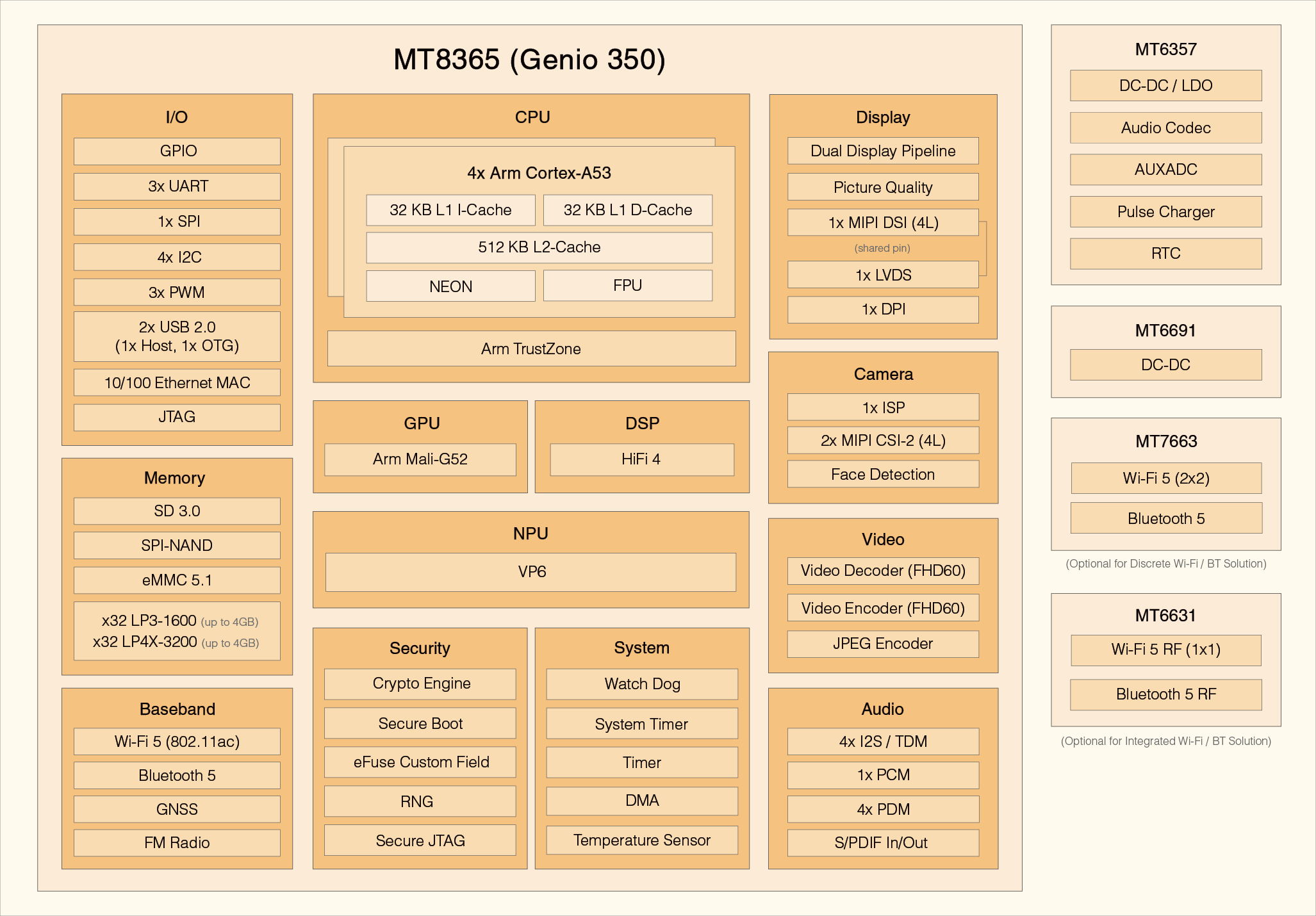 The block diagram provides a comprehensive overview of the functional blocks and interfaces of Genio 350, as well as the companion chipset that complements this SoC.
