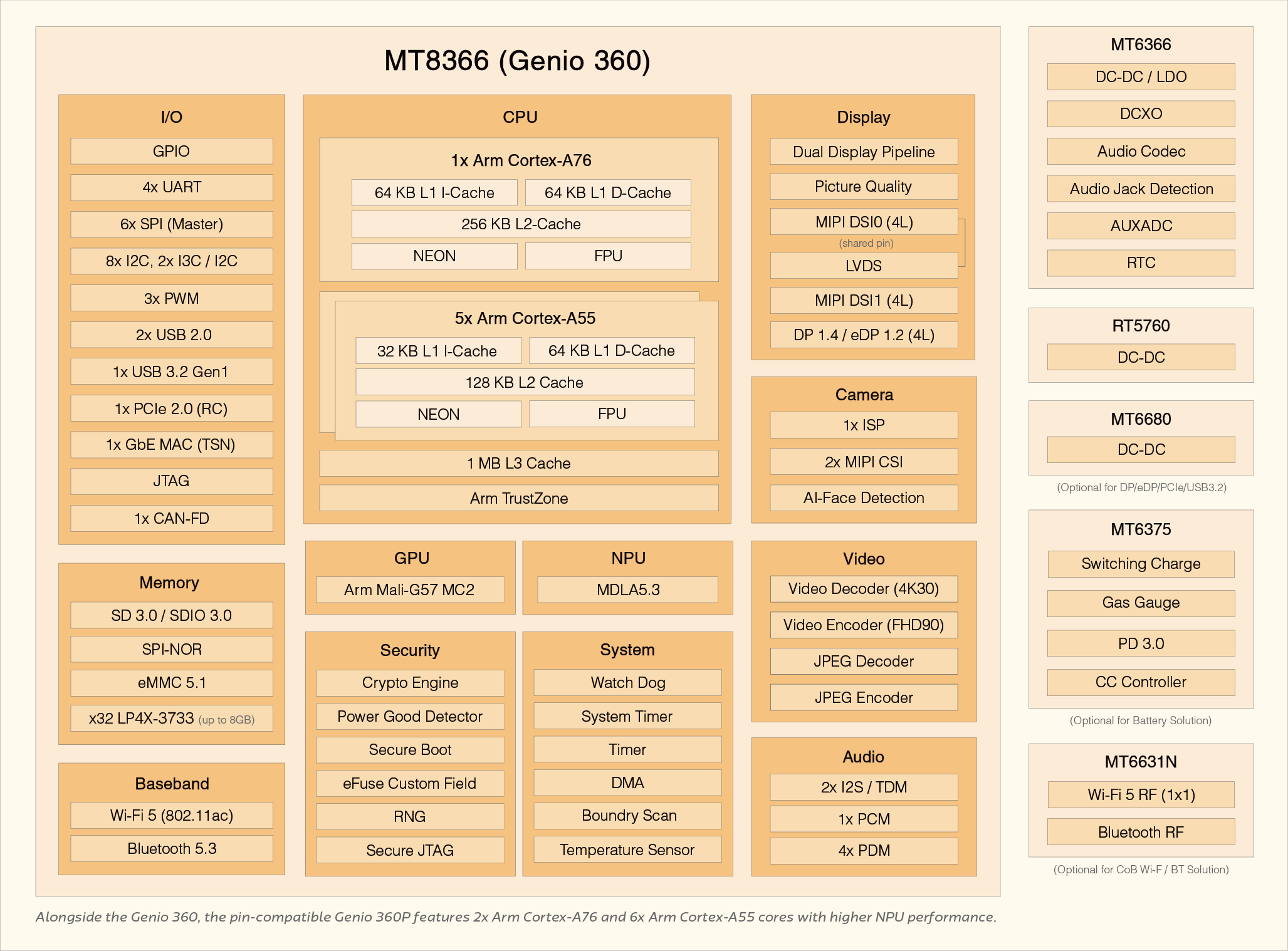 Alongside the Genio 360, the pin-compatible Genio 360P features 2x Arm Cortex-A76 and 6x Arm Cortex-A55 cores with higher NPU performance.