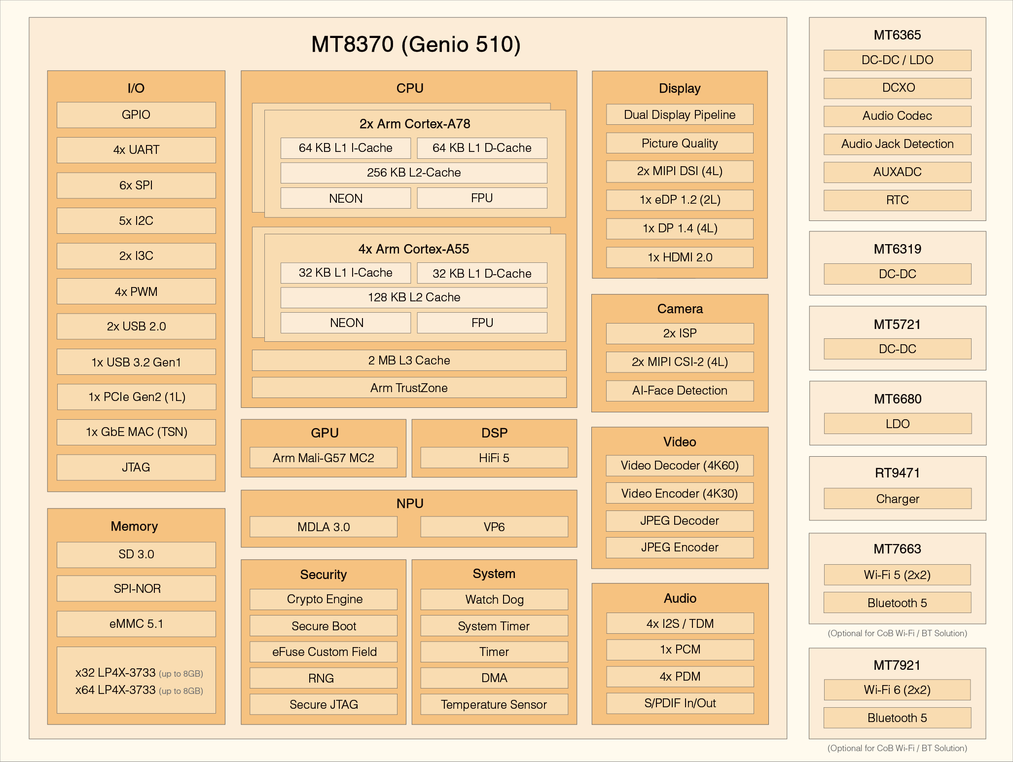 The block diagram provides a comprehensive overview of the functional blocks and interfaces of Genio 510, as well as the companion chipset that complements this SoC.
